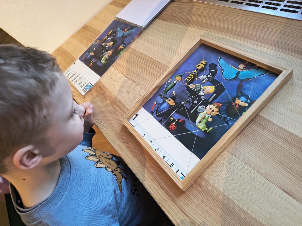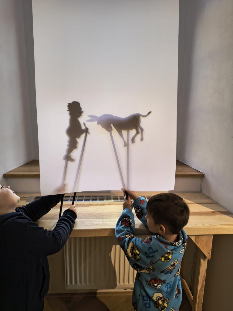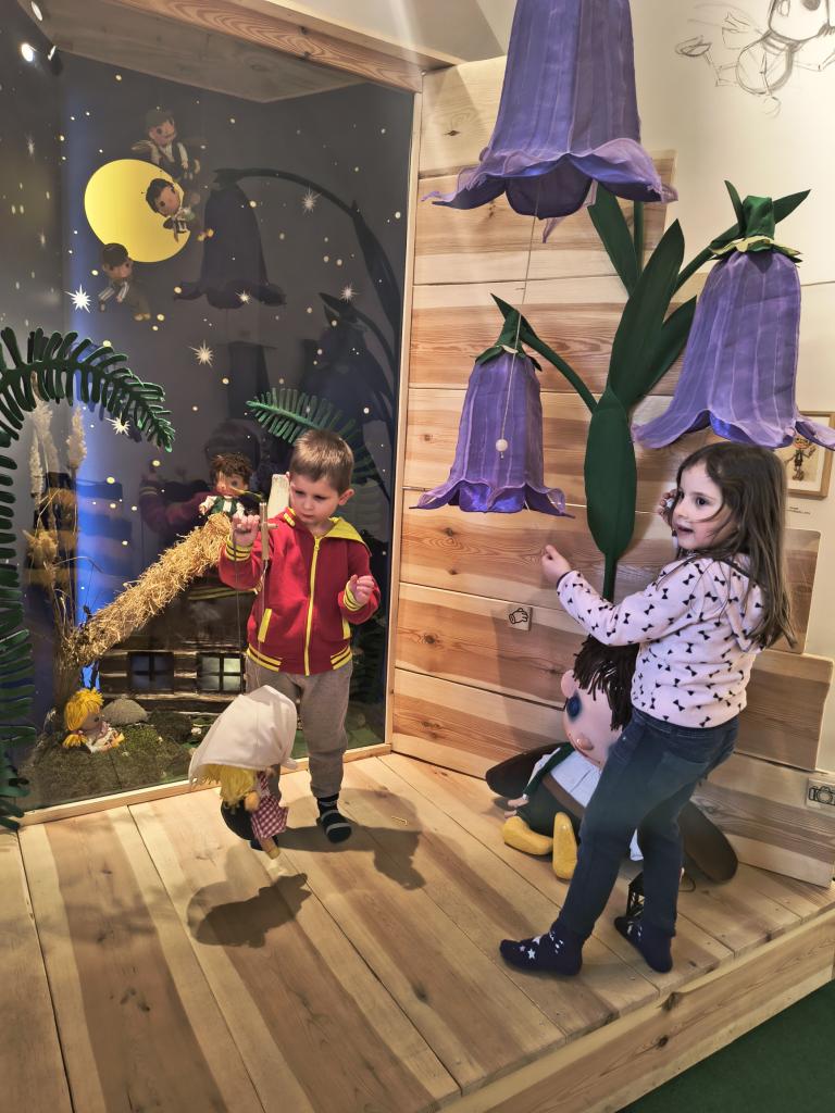 Nejprve naše kroky vedly do expozice Zdeňka Podhůrského. Šlo velmi pěknou komentovanou prohlídku. Vidět na vlastní oči originální loutky z večerníčku Broučci, ale i postavičky Neználka nebo Čmeláka Aninku, bylo jako vstoupit do kouzelného snu. I když nás v průběhu dne opět trochu potrápila doznívající střevní chřipka, děti byly neuvěřitelně statečné a výstavu si i přes únavu maximálně užily. Jako vzpomínku si děti v rámci workshopu odnesly krásné omalovánky čokoládového chlapečka.
