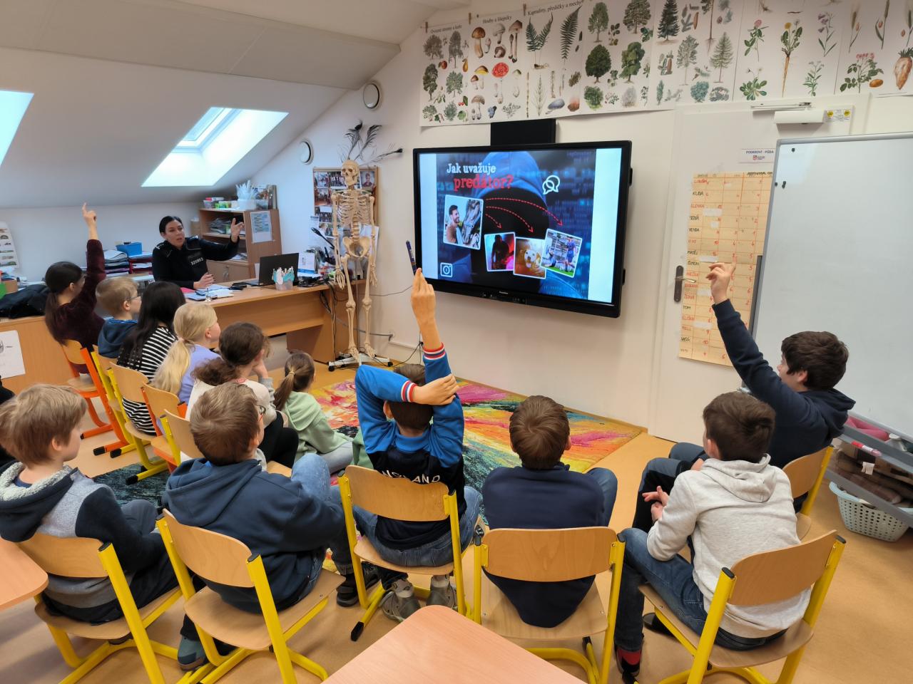 Ve středu 27. 3. se žáci 4. a 5.ročníku zúčastnili interaktivní besedy na téma Nebezpečí zneužívání sociálních sítí, kyberšikana a trestní odpovědnost. Žáci se dozvěděli, jak sociální sítě snadno manipulují dětmi, jak a proč je nebezpečné se stýkat přes sociální sítě s neznámými lidmi, dávat na sociální sítě své fotografie a a soukromé informace, např. z dovolených, ze zájezdů, škol přírodě apod. Rovněž, jak je důležité, nebýt závislý na počítačích, mobilech, tabletech a další digitální elektronice a jak snadno si může člověk již v dětském věku vypěstovat závislost. Jak a kdy může přijít útok ze sociálních sítí, kdy agresor vystupuje anonymně nebo pod falešnou přezdívkou, vytváří falešné profily na sociálních sítích. Odhalit ho není pro Policii ČR velkým problémem, spíše její řešení a dokazování. V závěrech obou hodin se rozběhla velká diskuse. Dotazem bylo zjištěno, že řada žáků má se sociálními sítěmi již své zkušenosti, i když možnost vstupu na sociální sítě je omezena věkem. Někdy však o tom rodiče ani nevědí, že jejich dítě je již aktivní na sociálních sítích.